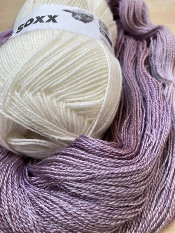OverzichtEcru sokkenwol en Handgeverfde Wol/zijde - lace in ouderoze/aubergine tinten